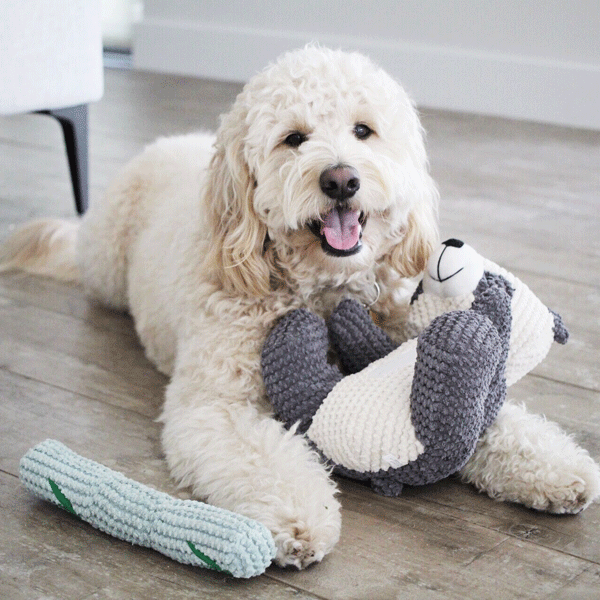 This playful and interactive panda toy contains a secondary bamboo stick toy that’s attached with a double stitched velcro that makes a “crrrrrunch” sound when they are pulled apart. The outside material is super soft, yet durable and tug resistant Plush Pearl material. Perfect for dogs who love to snuggle with toys or inquisitive dogs who want more stimulation!