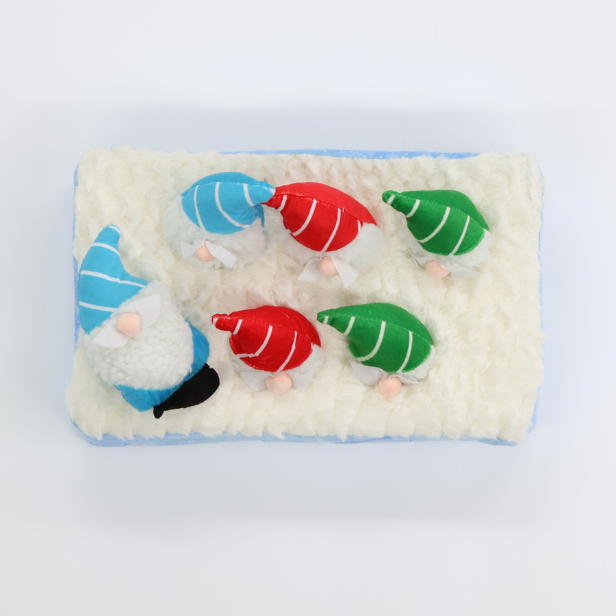 The Snow with Gnomes is a winter wonderland of enrichment fun! This interactive toy set includes a foam base and 6 squeaky holiday gnomes designed for hide-and-seek play.