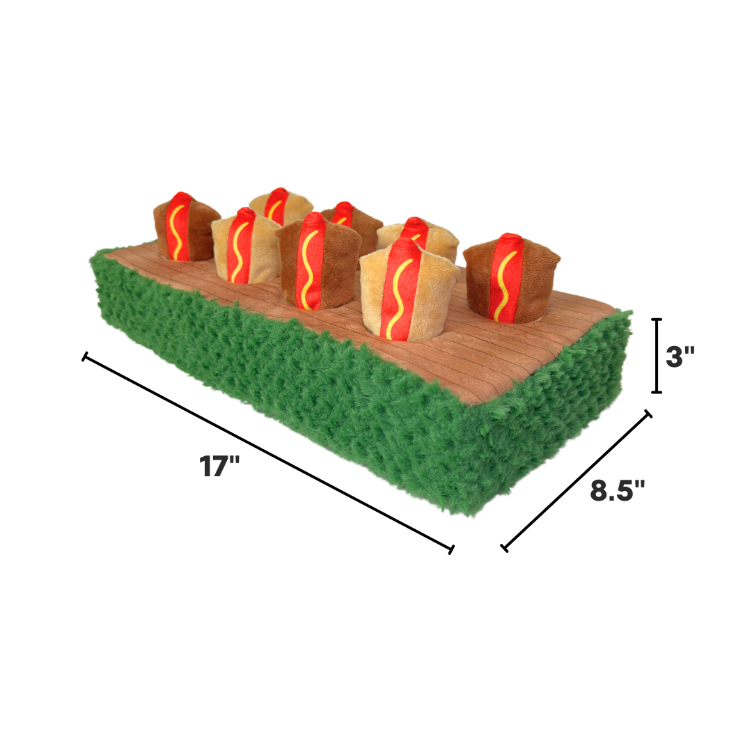 Glizzies is an interactive dog toy featuring a memory foam base and 8 plush toys, each resembling one of the Weens in their ICONIC hot dog costumes.